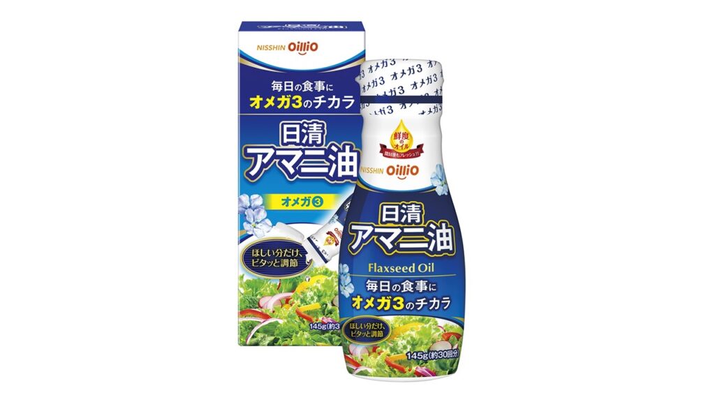 アマニ油に多く含まれるオメガ3(α-リノレン酸)は必須脂肪酸で体内で作ることができないため、食品から摂取する必要があります。日清アマニ油なら、1日分のオメガ3が小さじ1杯で摂取可能です(n-3系脂肪酸の成人1人日当たりの摂取目安量は1.7 ~2.3 g/厚生労働省「日本人の食事摂取基準2025年版」)。