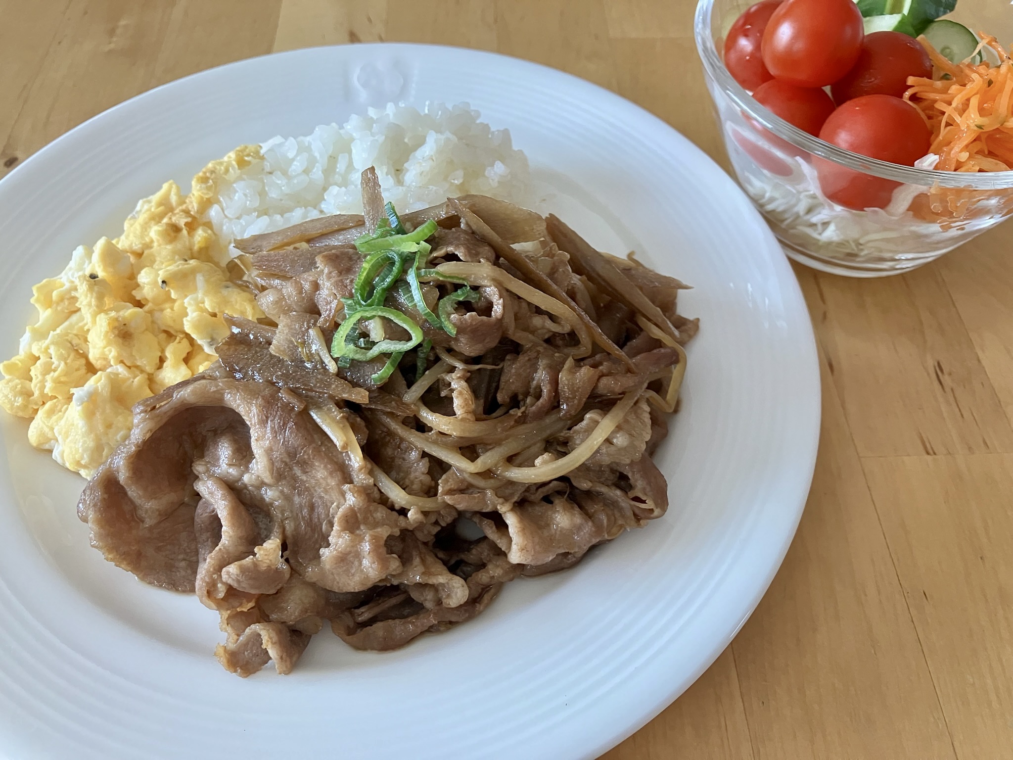 この日は少し残っていた豚こま、もやし、冷凍ストックのささがきごぼうを使って簡単ポークライスにしてみました☆