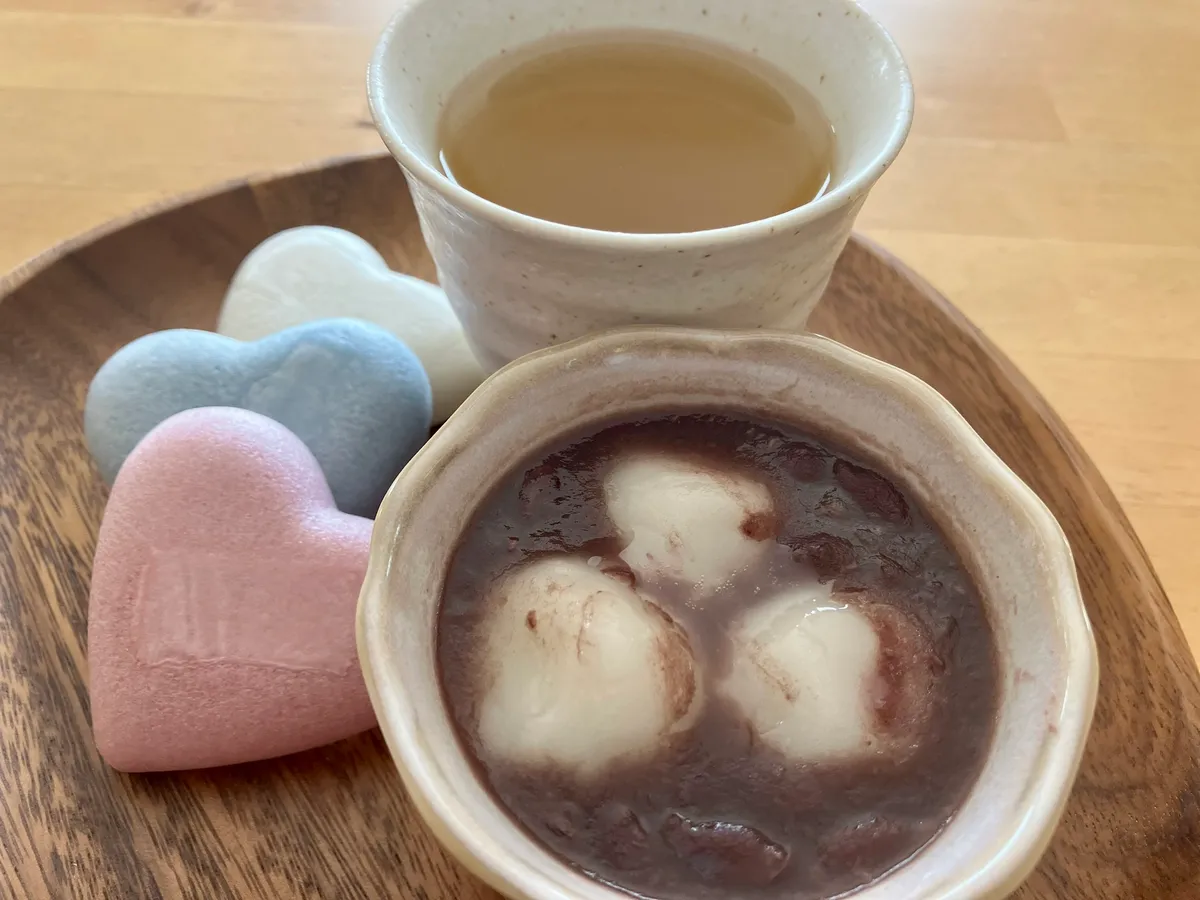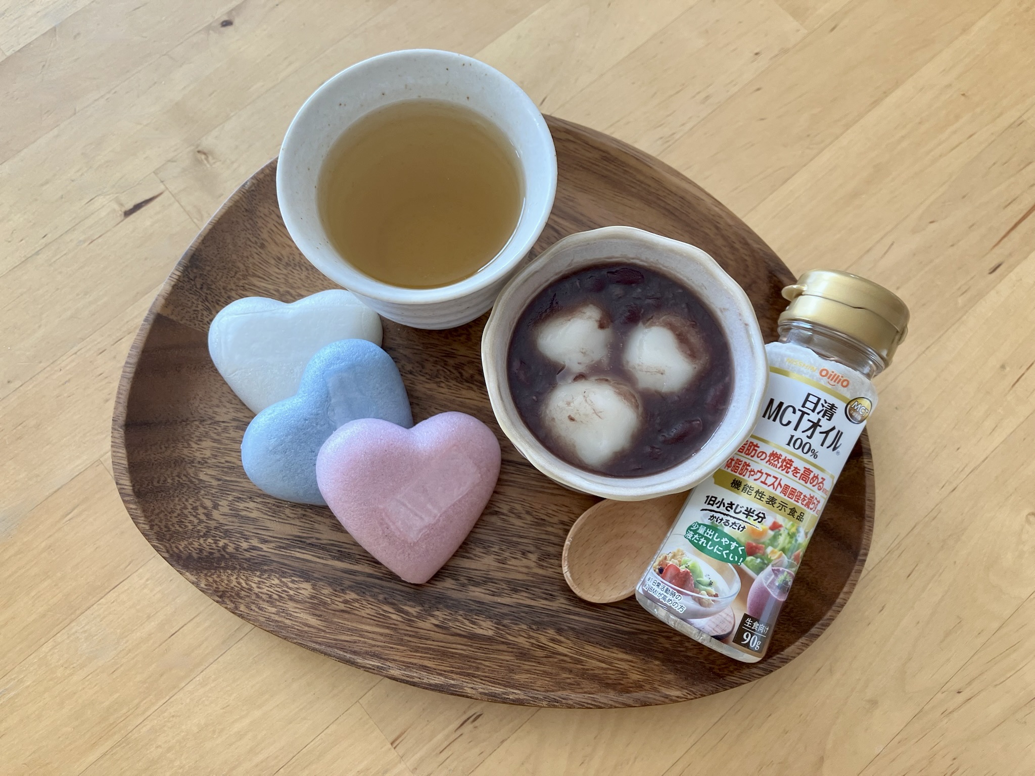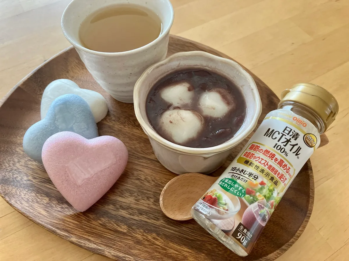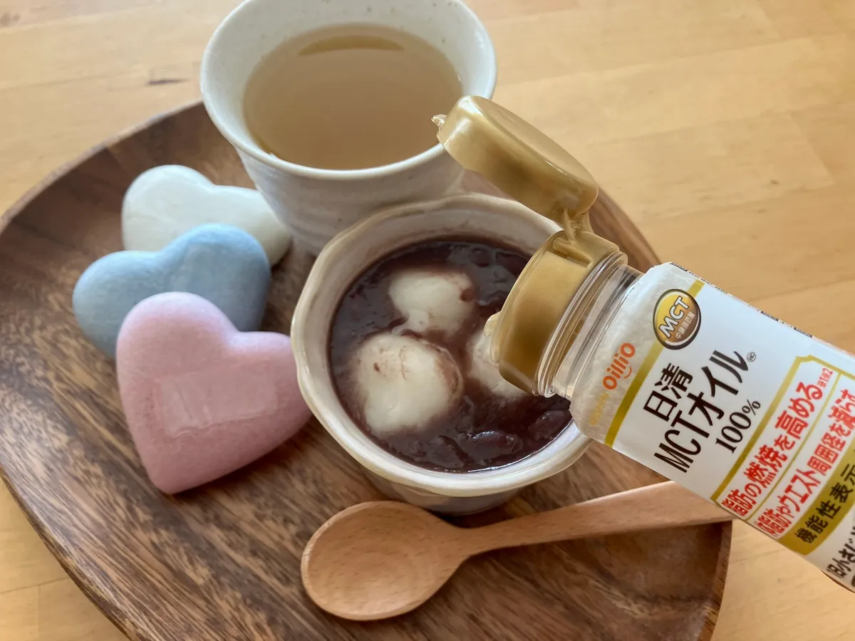 できたての白玉ぜんざいに、MCTオイルをたらり。