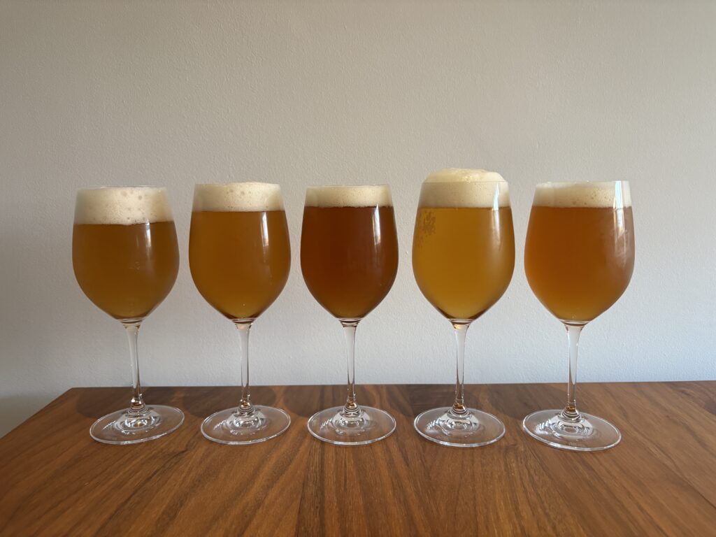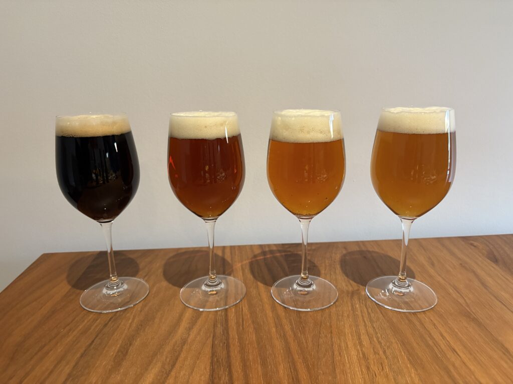 後日自宅でも飲み比べてみました。ビールやおつまみを一種類ずつではなく一度に並べたところは自己流です。なので、正解を当てるのではなく、何がどのビールかを知った上で楽しく味わいました。