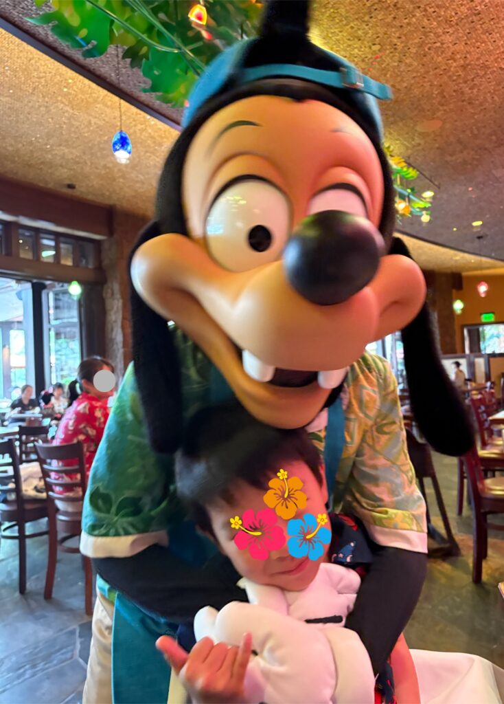 ミッキー以外のキャラクターが怖い次男、突然のグーフィー(しかも日本よりも身長がかなり高い)の登場で恐怖のあまり逃げていきました…
