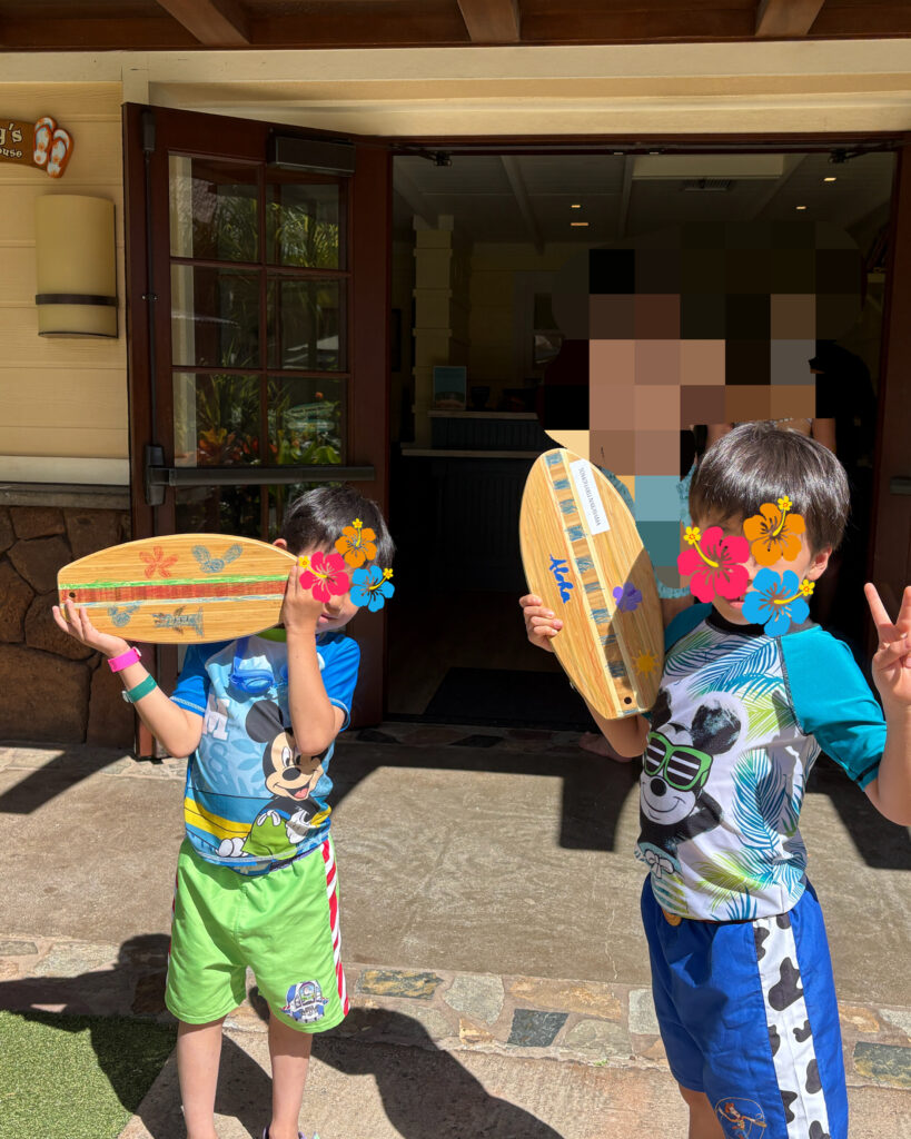 サーフボードを工作で作ったそう。親がいなくても、自分たちで英語で過ごせたことが自信につながったようで、この後は「英語で注文したい!」と自分から英語を話すことも増え、いい経験になりました。