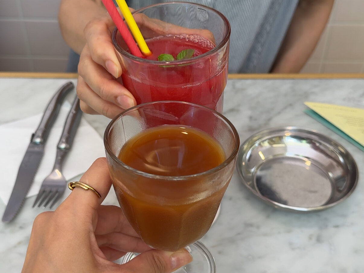 ドリンクも印象的で、黒パンを発酵させたリトアニアの伝統ドリンク「ギラ」。少し黒糖ビールのような風味でクセになる美味しさ!母が頼んでいたベリー系の「モルス」も爽やかな味でした!
