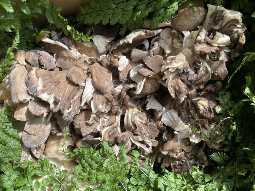 届いた舞茸はシダ植物に包まれ堂々たるいでたちで、思わず拝んでしまいました(写真は500g)。