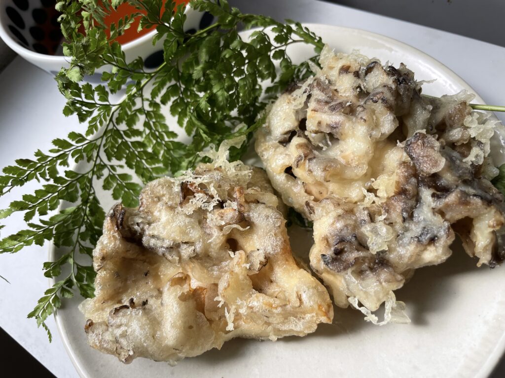 舞茸は水分が多いからか、ナスやかぼちゃよりカラっと揚げるのが難しかったです。