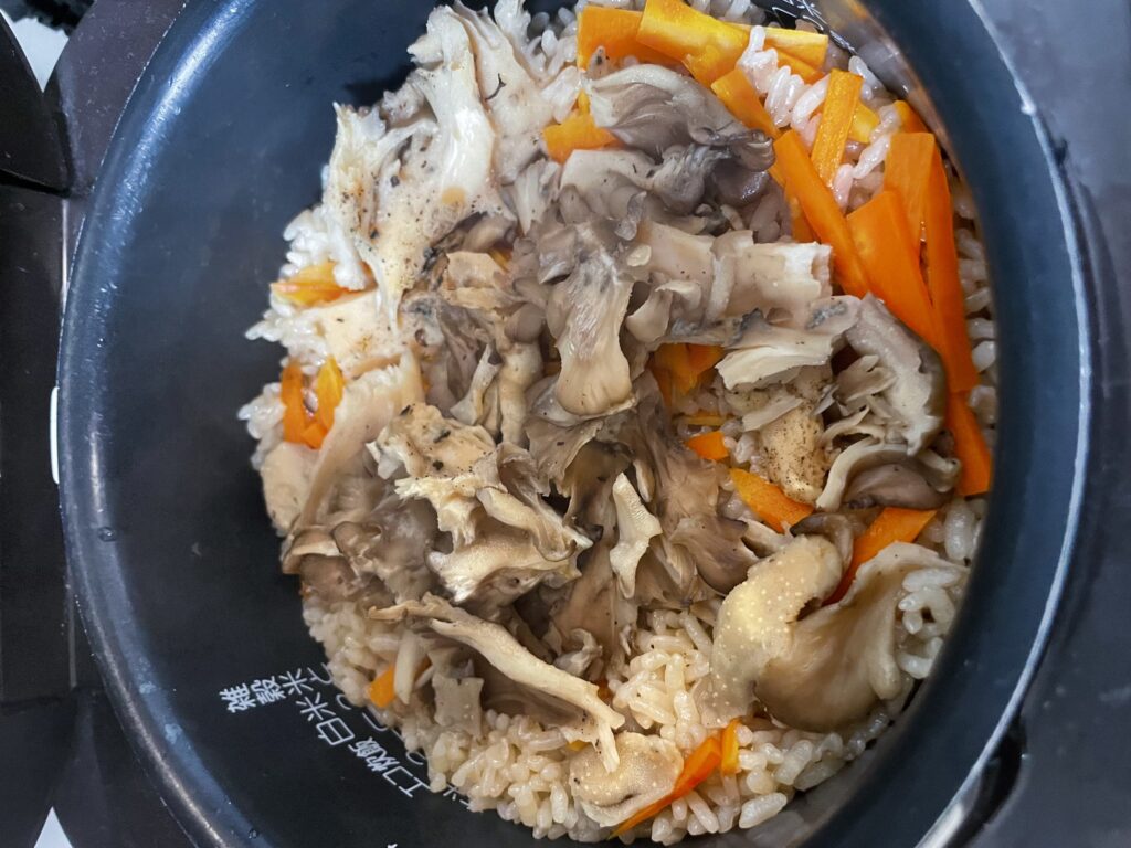 新米に舞茸、人参を合わせて、だし汁で炊き上げます。