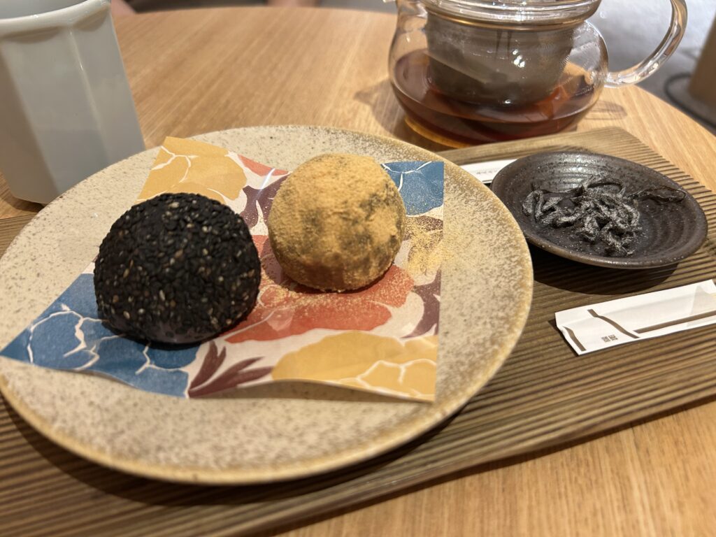 おはぎも有名なので、きなこと黒胡麻の2種をセレクトして頂きました。小ぶりなサイズで程よい甘さ。とても美味しかったです。付け合わせの塩昆布は舌に残る甘さをリセットしてくれ、無限甘辛ループに突入しそうでした。
