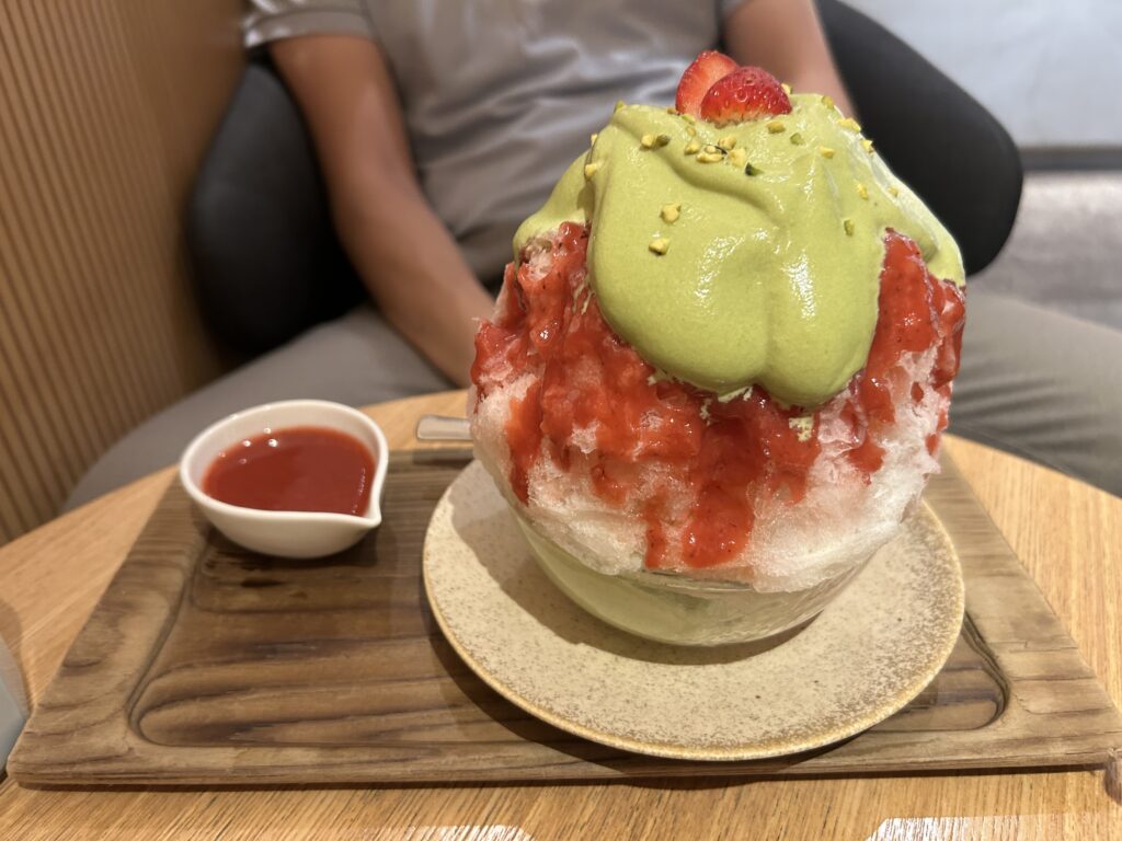 かき氷の上には、いちごソースとピスタチオと抹茶のエスプーマがかかっています。エスプーマはとってもまろやか。中にはいちごのコンポートが入っており、いちご好きにはたまりません◎別添えでいちごソースもついてくるのが嬉しかったです。