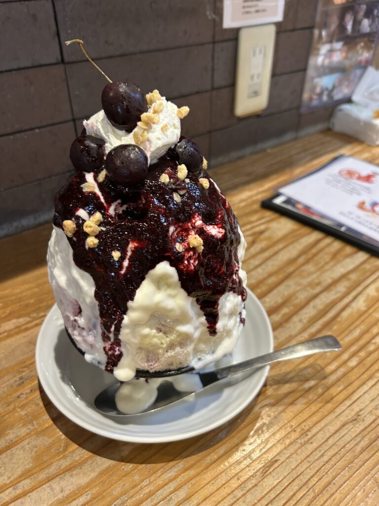 こんもり盛られたかき氷に、真っ赤なアメリカンチェリーのソースがたっぷりとかかっています。ソースの甘酸っぱさと、濃厚なチーズピューレとの掛け合わせが最高に美味しかったです。アメリカンチェリーの果肉はトップにはもちろん、中にもゴロゴロ入っているのが嬉しいです。適量のグラノーラもカリカリとした違ったテイストをもたらしてくれます。アメリカンチェリー好きにはたまらない、食べ応えのある一品でした!