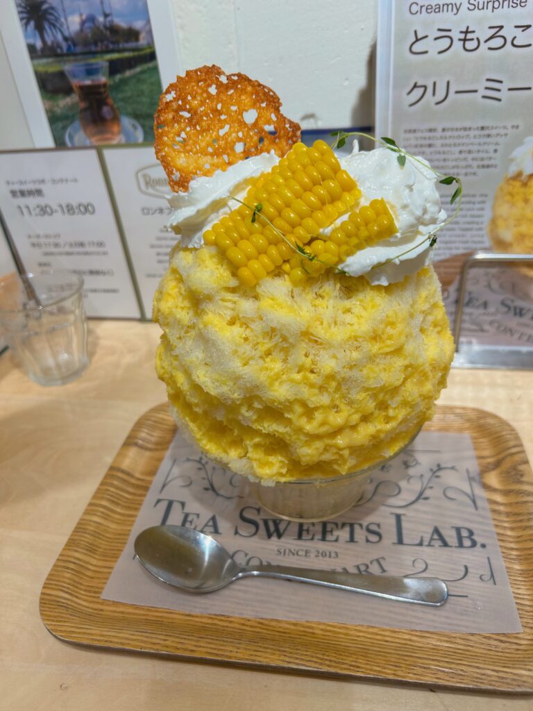北海道産糖度18度の品種「甘いんです」を使用したかき氷。「甘いんです」はまるで果物のように甘く、口の中に一気にトウモロコシ畑が広がります。