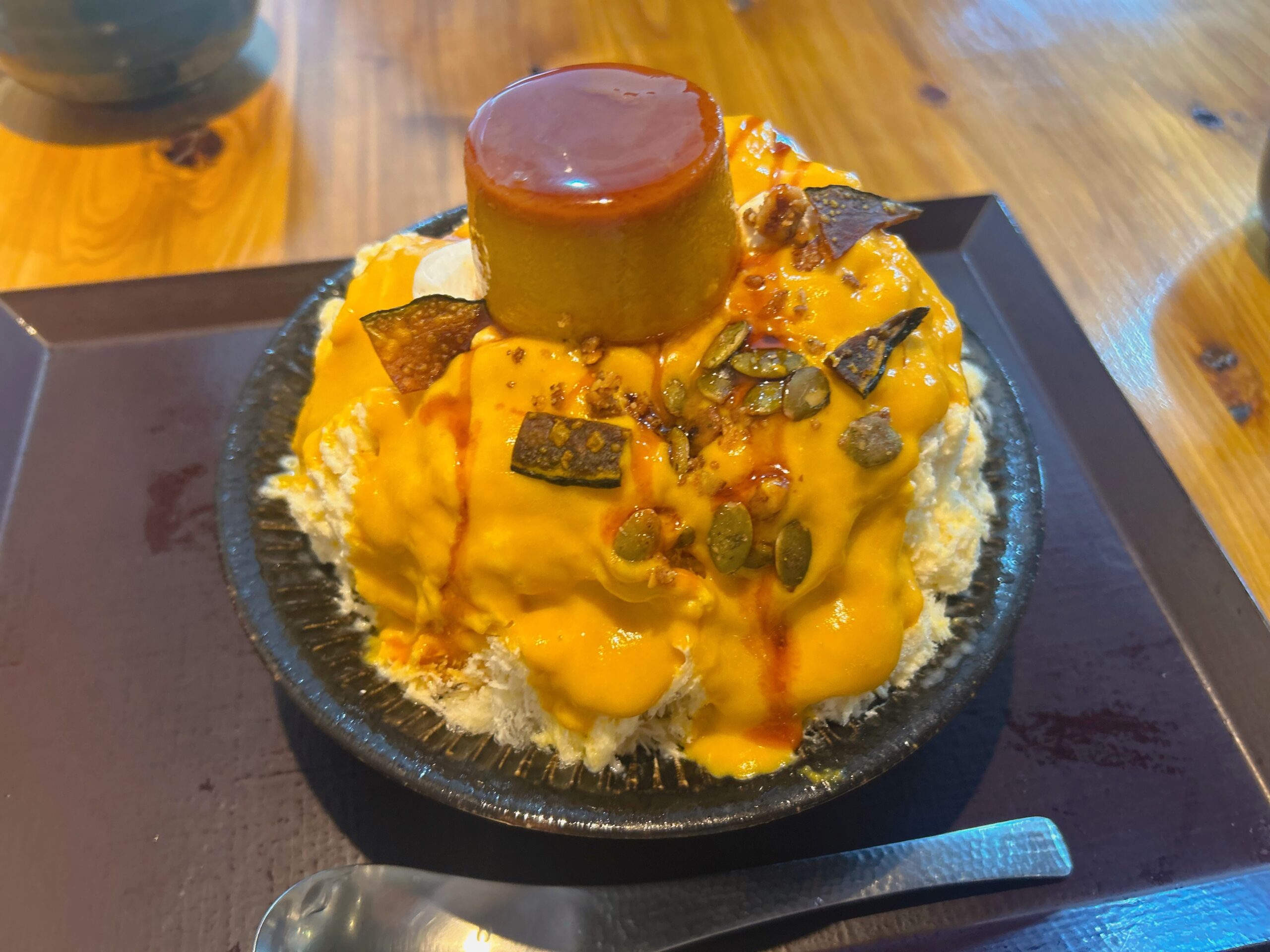 構成は、かぼちゃ餡、オーツミルク、アングレーズミルク、パンプキンプディング、ホイップクリーム餡、粒あんマスカルポーネ、ドライフルーツラムコンポート、クルミキャラメリゼ、塩かけパンプキンシード、かぼちゃチップ、カラメルシロップ、粒あん。書き出すととんでもない数の食材が掛け合わされていることがわかります。全てが一体となった、かぼちゃ好きにはたまらない美味しいかき氷でした。特に上にのっているプリンがとっても美味しかったです!