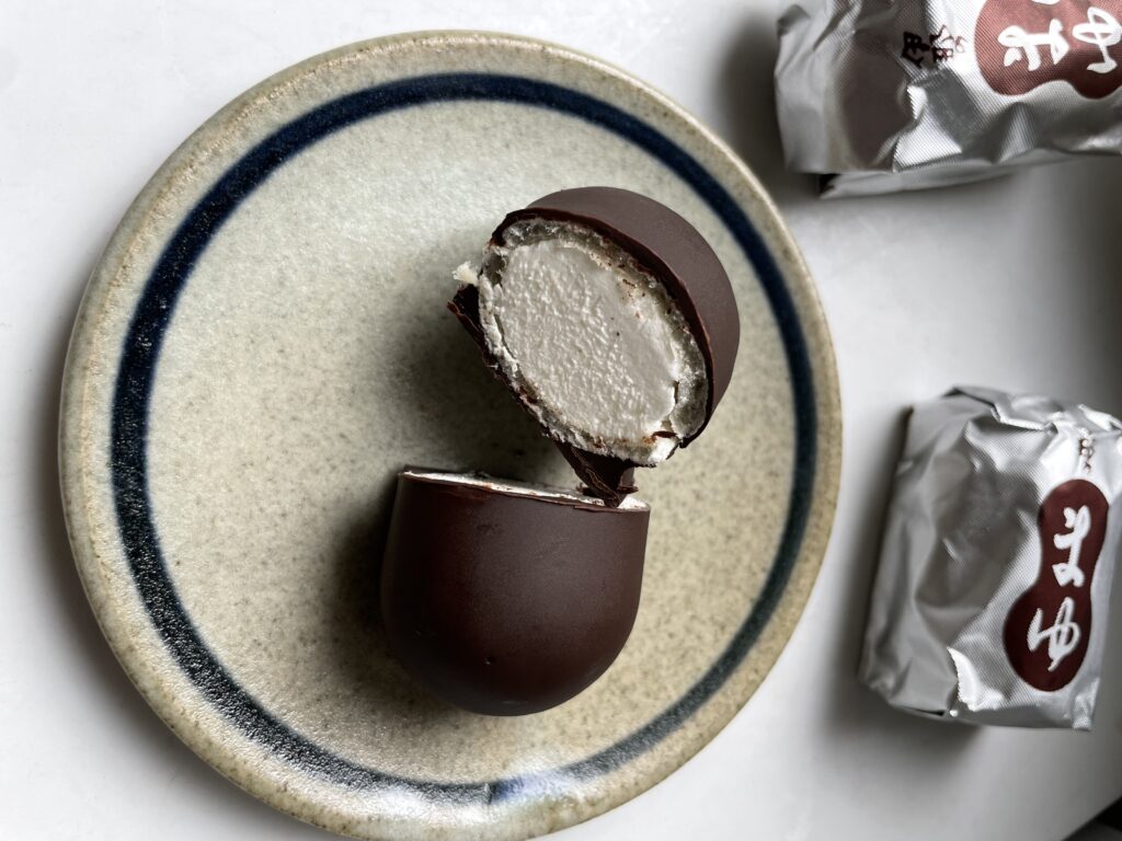 ホイップクリームをごく薄いもなかで包み、チョココーティングされています。