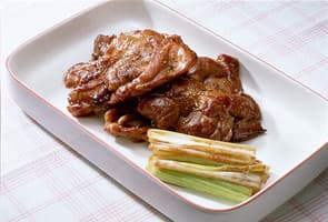 - 4フライパンにサラダ油を熱して汁気をきった1.の肉を焼き、八分程度火が通ったらいったん取り出す。続いてセロリとねぎをさっと炒めてこれも取り出し、肉の漬け汁を入れて強火で軽く煮つめたあと、肉とセロリ、ねぎを戻し、フライパンをゆすって煮汁を全体にからめる。好みで七味または一味唐辛子をふる。