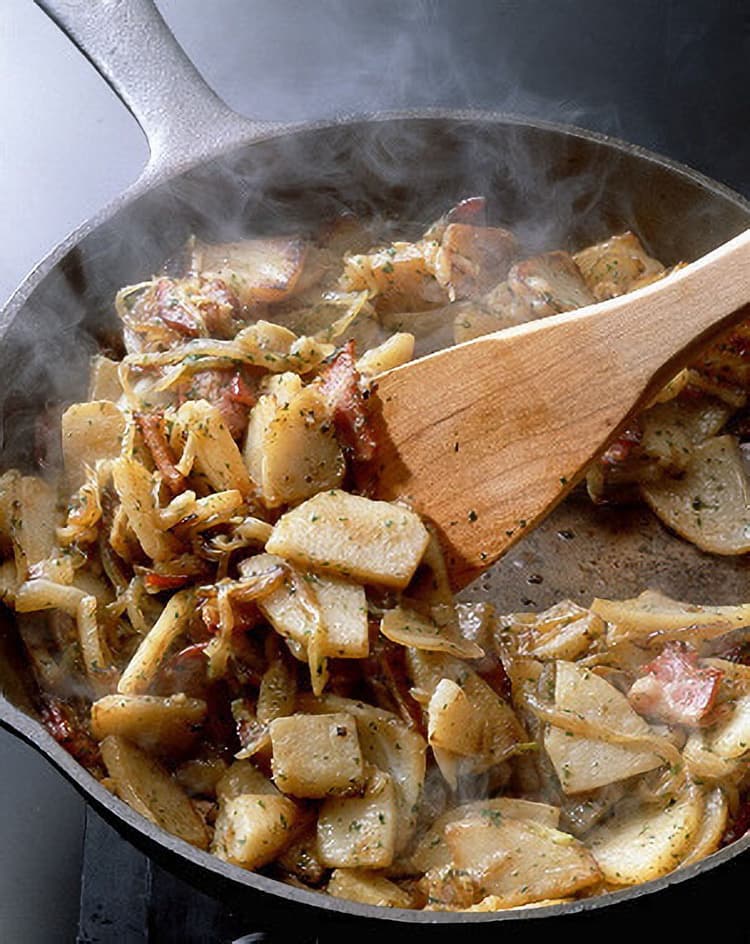 フライパンにバターとベーコン、にんにくのみじん切りを入れてよく炒め、ベーコンの脂が出たら、玉ねぎを入れてしんなりするまで炒める。じゃがいもを加えてさらに炒め、全体に焼き色がついたら、コショウとパセリをふって仕上げる。