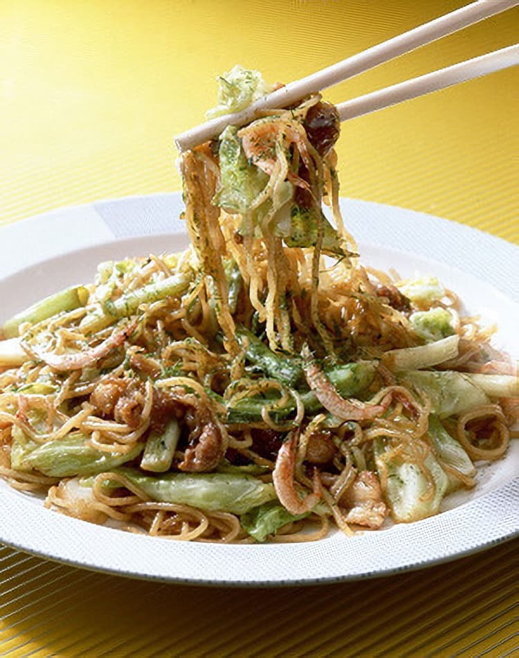 中華鍋に油大さじ1と1/2を加え、麺2玉をほぐしながら炒め、3.の具を半量戻してさらに炒め、中華あじ2ふり、ソース大さじ2、しょうゆ大さじ1、コショウ少々で調味する。残りも同様に炒めて調味する。青のりをふって食べる。
