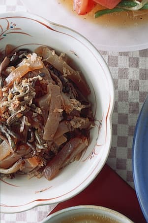 - 3しょうゆ、酒を加えてさらに強火で炒め合わせ、汁けがなくなってきたら削り節を加え、ざっと混ぜ合わせる。 (1人分76kcal)