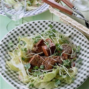 牛肉にサラダ油少々、塩、こしょう、にんにくの薄切りをまぶして下味をつけておく。レタス、ラディッシュ、貝割れ菜、みょうがは充分に水けをきり、フレンチドレッシングでさっとあえ、4等分して器に敷いておく。