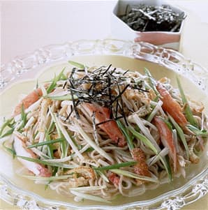 - 3そばをボールに入れ、ドレッシングの1/2量を加えてよくあえる。次に長いも、油揚げ、かまぼこ、万能ねぎを散らし入れ、食べる直前に残りのドレッシングを回しかけてかるく混ぜる。皿に盛り、焼きのりをふりかける。 時間35分、熱量372kcal、塩分2.7g(1人分)