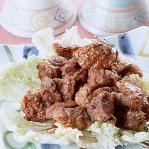 - 3揚げ油を中温(小麦粉を同量の水で溶いて数滴落とすと、鍋底近くまで沈み、すぐに浮き上がってくる程度)に熱し、レバーを入れて箸で返しながら約2分、からりと揚げ、網じゃくしなどで取り出して油をきる。揚げたてを漬けだれに入れて上下を返すようにかるく混ぜ、味をからめる。白菜はしんの部分を除いて手で食べやすくちぎり、皿に敷いて、漬けだれごとレバーを盛る。 時間40分、熱量180kcal、塩分2.4g(1人分)