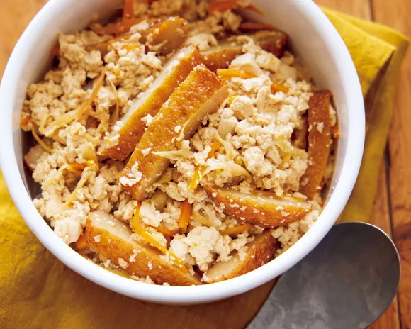 - 2鍋に湯を沸かして塩を入れ、青梗菜を茎から入れて1分ほどゆでる。水にとってさまし、水けを絞って長さを3等分にする。
