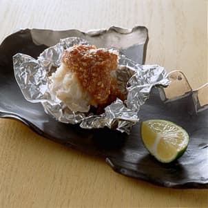 - 2アルミホイルを8cm四方に切り、里いもをのせてまわりを包むように少し折り、合わせみそをかける。オーブントースターで3~4分、少し焦げ目がつくまで焼いて器に盛り、すだちを添える。 (1人分99kcal)