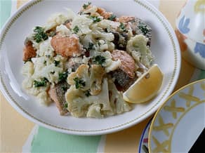- 3フライパンをさっと洗って火にかけ、バターを熱する。バターが溶けたら、カリフラワーを入れ、塩小さじ1/2をふり、木べらで大きく混ぜながら中火で炒める。全体に油が回ったら酒をふり、ふたをしてそのまま中火で1分ほど蒸し焼きにする。カリフラワーがしんなりとしたら、鮭を戻し入れ、塩、こしょう各少々をふる。器に盛ってパセリを小さくちぎって散らし、レモンを添える。 時間20分、熱量304kcal、塩分1.5g(1人分)