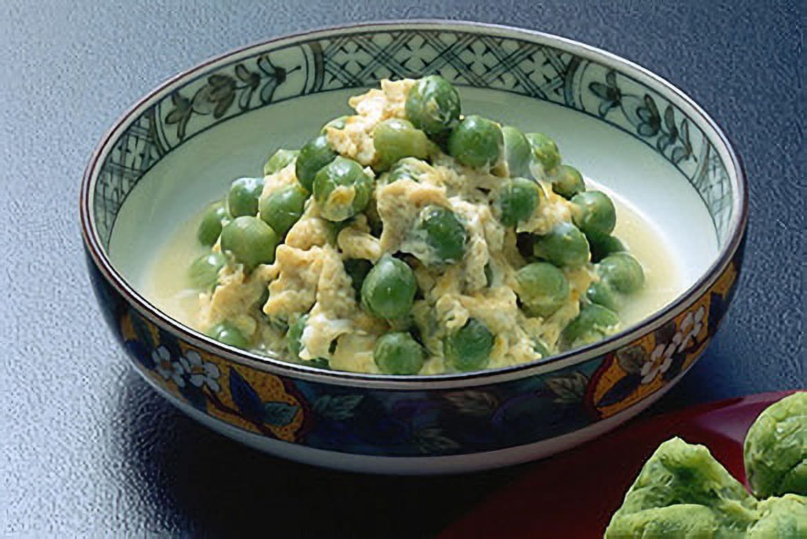 えんどう豆は、塩を加えた熱湯で10分くらい中火でゆで、冷水にとってざるに上げ、水けを充分にきる。卵はよく溶きほぐしておく。