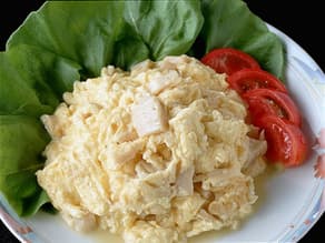 - 3中華鍋にサラダ油を熱して、卵液を一気に流し入れ、へらで大きく全体を混ぜながら、強火で炒める。全体が半熟状になったら、火からおろして、野菜を盛った皿に盛る。 時間10分、熱量331kcal、塩分0.9g(1人分)