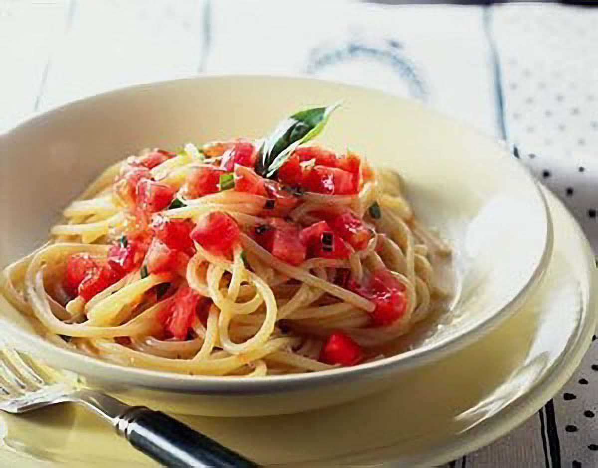 夏にぴったりな冷たいパスタ。刻んだバジルがトマトの甘みを引き立てます。