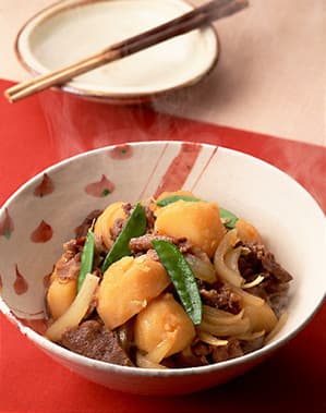 - 1じゃがいもは皮をむいて一個を6つに切り、切ったそばから水にさらしてすぐにざるに上げ、水けをきる。玉ねぎは縦半分に切ってから幅7~8mmのくし形に切る。牛肉は一口大に切る。きぬさやはへたと筋を取り、熱湯で色よくゆで、冷水にとって水けをきる。鍋に煮汁用調味料を入れ、中火にかけて、煮立ってきたら牛肉を入れる。