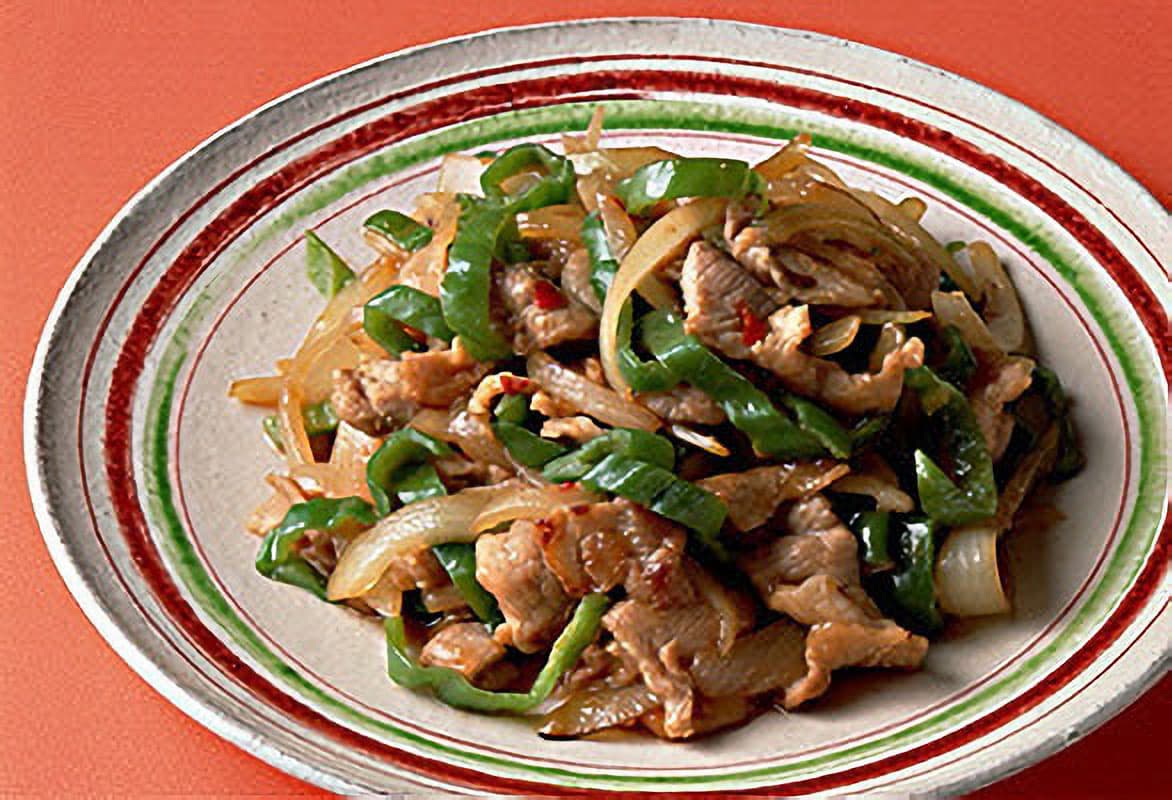 続けてサラダ油大さじ1をたして強火にし、赤唐辛子、玉ねぎ、ピーマンの順に炒める。玉ねぎがしんなりとしたら豚肉を戻し入れる。合わせ調味料を再び混ぜて加え、手早く混ぜて調味料を全体にからめ、皿に盛る。
