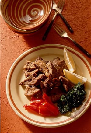 - 3レバーにカレーごろもをまぶす。揚げ油を低温(小麦粉を同量の水で溶いて数滴落とすと、鍋底にいったん沈んで浮いてくる状態)に熱してパセリを入れ、カリッとするまで揚げる。続けてピーマンを加え、色よく揚げて、熱いうちに塩、こしょうをふっておく。火を強めて油を中温(小麦粉を同量の水で溶いて数滴落とすと、鍋底近くまで沈んですぐに浮いてくる状態)に上げ、レバーを入れてカリッとするまで揚げる。野菜とともに器に盛り、くし形に切ったレモンを添える。 (1人分269kcal)