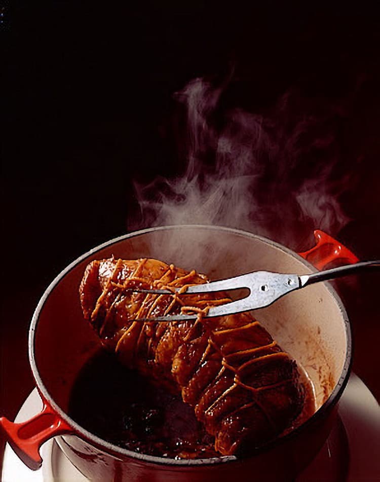 鍋に水1と1/2カップと煮汁の材料、にんにく、ねぎ、しょうがを入れ、豚肉を加えて弱火にかける。煮立ってきたらアクを取り、アルミホイルで落としぶたをする。ときどき落としぶたを取って、豚肉に煮汁を回しかけながら45~50分煮込んで火を止め、そのままさます。