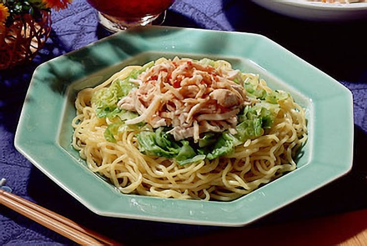 中華麺は、たっぷりの湯で袋の表示どおりにゆでてざるに上げ、手早く水洗いして水けをきり、1/4量ずつ器に盛る。キャベツ、鶏肉をのせ、たれをかけていただく。