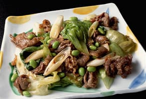 中華鍋にサラダ油を中火で熱し、ねぎ、しょうがを入れて香りよく炒める。2.の牛肉、レタスを加えて炒め合わせ、全体に油が回ったら、合わせ調味料、枝豆を加える。大きく混ぜて、調味料をしっかりとからませ、器に盛る。