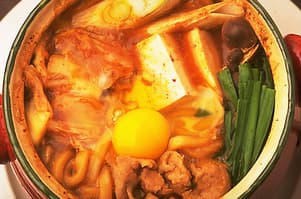 うどんに3.の汁の1/4量ずつを注いで中火にかけ、ときどきアクを取り除きながら、豚肉に火が通るまで煮る。仕上げに、好みでラー油、コチュジャンを加え、卵を落とす。