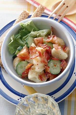 - 3ボールにじゃがいも、きゅうり、トマトを入れ、ドレッシングを加えてあえ、器に盛って、ベーコンを散らす。 (1人分199kcal)