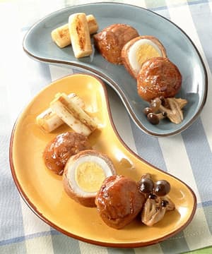 丸ごと卵を豚肉でくるり。見た目にも楽しい一品です。しっかりした甘辛味で、ごはんもすすみます。
