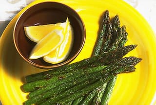 アスパラの自然な甘みが引き立てられる素揚げ。シンプルにレモンと塩でどうぞ。