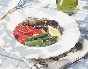 アスパラガスは全体にオリーブ油を薄くからめてから、オーブントースターで4~5分焼き、塩、こしょう各少々をふる。器に野菜を盛り合わせ、好みでレモンを絞りかける。