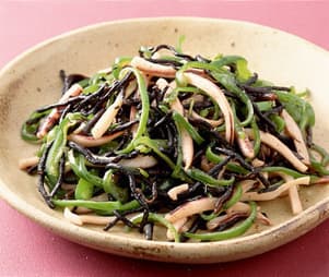 ひじきは長さ4cmに切る。するめいかはわたを引き抜き、足を切り離す。胴は長さ4cmの細切りにし、長い足は半分に切り、えんぺらは細切りにする。ピーマンはへたと種を取り、細切りにする。