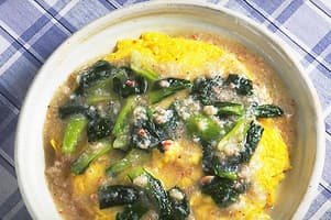 中華鍋をペーパータオルでさっと拭き、サラダ油大さじ1/2をたして再び強火で熱する。青梗菜の茎、葉、かにを順に入れ、油が回ってつやが出るまで炒め、スープを加える。煮立ったら片栗粉大さじ1を水大さじ2で溶いたものを少しずつ加えてとろみをつけ、ごま油小さじ1を回しかける。卵の上にあつあつのあんをかけていただく。