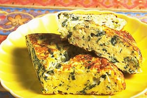 フライパンにごま油大さじ1/2を中火で熱し、高菜、ねぎをさっと炒めて溶き卵のボールに入れる。フライパンをざっと洗ってごま油大さじ1を中火で熱し、卵液を一気に流し入れて大きくかき混ぜる。半熟状になったらふたをして、弱火で3分ほど焼く。焼き色がついたら裏返し、さらに2分ほど焼いて食べやすく切り分ける。