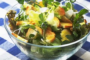 レタス、サニーレタスは水洗いし、5cm四方に切る。Aは冷水でパリッとさせて水けを切り、レタスと混ぜて器に盛り、1.をちぎって散らす。ドレッシングと、塩、こしょう各少々をふり、全体を混ぜていただく。