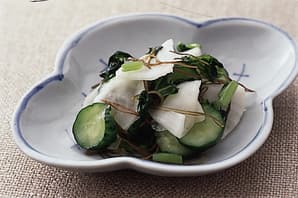 かぶの葉は長さ1cmに切ってボールに入れ、塩小さじ1/2をふってかるくもむ。そのまま10分ほどおき、水けを絞る。大根は皮をむき、厚さ3mmのいちょう切りにする。きゅうりは塩少々をまぶしてまな板の上でころがし、さっと洗って厚さ5mmの輪切りにする。