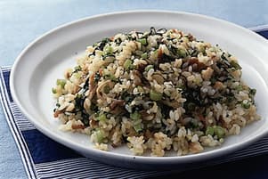 中華鍋にサラダ油大さじ2を入れて強火で熱し、豚肉をほぐしながら炒める。パラパラとほぐれて焼き色がついたら、野沢菜とねぎを加え、ねぎがしんなりするまでさらに炒める。ご飯を加え、ほぐしながらさらに3分炒める。全体にパラリとしてきたら、しょうゆ大さじ2を回し入れ、塩、こしょう各少々をふって混ぜ合わせ、火を止めて器に盛る。熱量407kcal、塩分2.7g(1人分)