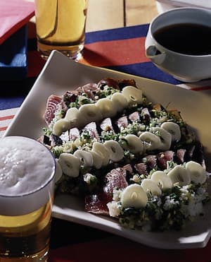 串を抜いて厚さ1cmに切る。酢大さじ3をふりかけて、身をしめるとともに、たれとの味のなじみをよくする。皿にかつおを盛り、にんにく以外の薬味と大根おろしを混ぜてのせる。さらににんにくをのせ、たれを回しかけて食べる。