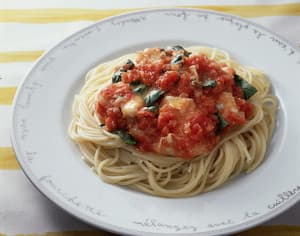 鍋に2リットルの湯を沸かし、塩、オリーブ油各大さじ1を加える。再び煮立ったらスパゲティを加えて2~3回混ぜ、弱めの中火で袋の表示時間どおり、ゆでる。鍋に分量のトマトソースを入れて、中火にかける。