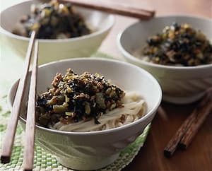 高菜漬けは細かく切る。赤唐辛子はへたと種を取ってみじん切りにし、ねぎもみじん切りにする。鍋に冷やむぎをゆでる湯を沸かしはじめる。