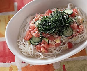麺がゆだったらざるにあけて流水でもみ洗いし、水けをきる。器に等分に盛って混ぜ合わせ、具もそれぞれにのせて青じそを飾る。